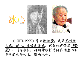 问:看到此图你会联想到什么?(学生自由说)你们知道著名爱心作家冰心先生看到此景联想到了什么吗? 预设(不知道,如果知道,加以表扬并就让该生说说对冰心的相关知识:哦,你说对了,那老师猜想你也一定对冰心奶奶有了解了。能说说吗)