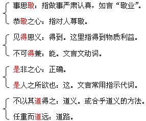 (7)则是曾子(孔子的弟子曾参)的语录,讲“士”必须具有心胸宽广、意志坚强的美德,因为他们任重道远。曾子这里指的“士”应该是那些有济世之才和远大抱负的人。