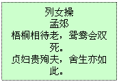 赏析: 本诗以梧桐共老、鸳鸯同死、心如不起波澜的井水等比喻,表现烈女对丈夫的忠贞。也是借烈女喻诗人自己志行的高洁。(操:琴曲中一种体裁)