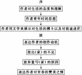 在《跋》的第一段中,作者讲到了自己的创作动机“我很早就说过,我不是为了要做作家才写小说:是过去的生活逼着我拿起笔来。”“我要向一个垂死的制度叫出我的‘我控诉’。”也讲到了作者的创作体验:“我仿佛在跟一些人一块儿受苦,跟一些人一块儿在魔爪下面挣扎。我陪着那些可爱的年轻的生命欢笑,也陪着他们哀哭。”正是由于巴金目睹了生活中那些悲惨的结局,目睹了那些可爱的年轻生命横遭摧残,才使得巴金的《家》是那样的感人,那样的富有生活气息。