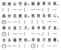 律诗的一、二句叫首联,三、四句叫颔联,五、六句叫颈联,七、八句叫尾联。一联中的上句叫出句,下句叫对句。同一联的出句和对句的平仄应该相反,即所谓“对”;上一联对句和下一联出句中的第二个字的平仄必须相同,即所谓“黏”。不符合“对”的规则叫“失对”,不符合“黏”的规则叫“失黏”。下面以《春望》为例,画出它的平仄格式(用“一”代表平声,“|代表仄声,用字与标准格式不同的加“○”表示):