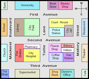 2. A: Hi. Could you tell me where the ______ is? B: Sure! The ______ is on the northwest corner of Mackeral and First, across the street from the university.