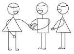 (6)教师画简笔画,让学生模仿此情景,进行对话,一边握手,一边交换名片,用所复习的句型设计对话内容。可三人一组进行操练。