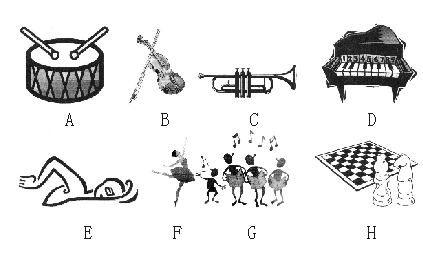 答案:A.drum B.violin C.trumpet D.piano E.swim F.dance G.sing H.chess