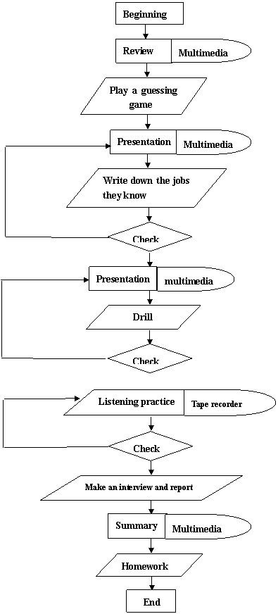 本节课抓住初中学生的心理特点,一开始就用他们乐于参与的游戏开局,增强课堂的趣味性、调动学生的积极性和主动性,同时也起到复习的作用。在新职业名称呈现之后,再次引入竞争机制,开展小组竞赛,更进一步活跃课堂,增强生生互动,同时起到新旧知识整合的作用。在目标语言的呈现方面,采用了“以旧引新”的办法,用 want to be结构引出本节课的目标语言be going to + do结构。在听、说能力训练的同时,本节课对读、写能力训练也设计了一定内容(Group work、homework).总之,本节课注重初中学生的心理特征,设计了活泼、有趣、参与性强、参与面广的课堂活动;注重师生互动、生生互动;强调新旧知识的整合;在强化听、说能力的同时,也进行了必要的读、写训练,使各项能力平衡发展。