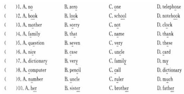 下面单词中都有一个划线部分与其他三个读音不同的。将其序号填入前面的括号内。