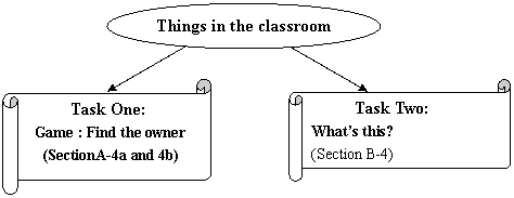 这部分的重点是引出本单元的话题---Things in the classroom,了解学生对教室中物品英语表达的熟悉程度并充分发挥学生的想象力。同时训练学生说的能力。