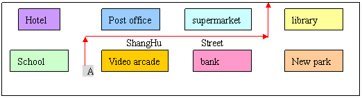 1. 图书馆在超市的对面。 2. 公园在银行的旁边。