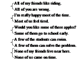 all 全部, most 大多数, some 一些, a few 少数, none 没有人。这些词与of连用,可用于一个有限定词的名词前,或人称代词前,而且要与代词的宾格连用。