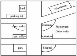 2. (向学生展示一张生活小区周边示意图, 用1b中的英文解释介绍小区附近设施名称。)