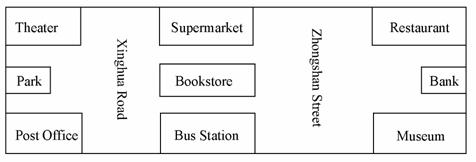 (让学生看图示, 假如现在一名学生在博物馆与银行之间, 想去剧院, 该怎么走? 请编一段对话。)