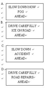 [解题思路点拨]这篇说明文的大体意思是:由于受山顶上弥漫的大雾或者融雪下面的冰等等因素的影响,冬季是易发生事故的危险季节。为了行驶安全,要遵循两个原则:一是平稳驾驶。加速或煞车时,动作要尽可能地轻缓一些。二是提防可能会发生的任何事情。路面上的雪越多,就应该把视线放得更远些。当路面出现潮湿,有雪、冰等情况时,将车停下来所需要的时间是不同的。随时准备控制车辆的运行,驾驶员就不会遇到麻烦。