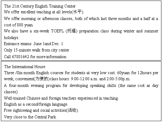 Suppose you work in a big company and find English very important for your job because you often deal with foreign businessmen. Now you are looking for a place where you can improve your English, especially your spoken English.