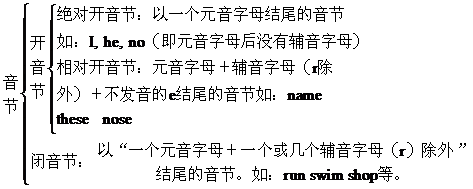 在英语中元音特别响亮(类似韵母),一个元音可以构成一个音节,例如I(我),a(一,一个),一个元音和一个或几个辅音结合也可以构成一个音节,如desk(课桌)。在英语中,双音节或多音节的词,每个词都有一个读得特别响亮的音节,叫做重音节,用重音符号“'”来表示,其他不读得特别响亮的音节叫非重读音节。我们根据组成音节的字母的组合形式,将音节分为开音节和闭音节。
