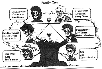 △制作family tree是英语国家的文化传统。我们来看看吉姆·格林,一个普通的美国男孩的family tree。