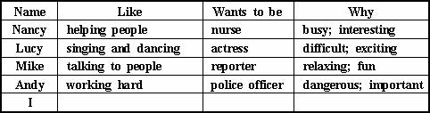 请根据表格里的信息,写一下这些学生今后想做的工作及理由,然后说一说自己的想法。(字数60字左右)