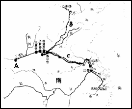 (3)材料二中的“涿郡” 和“江都”分别指现在什么地方?(2分)请在图中用D标出此“长河”的中心。(1分)