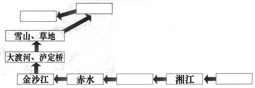 ⑵小明同学在看完电影后,绘制了一幅红军长征示意图,可是他漏填了红军长征中的几个关键地点,你能帮他补充完整吗?(请在图中方框内填出正确的地名,4分)