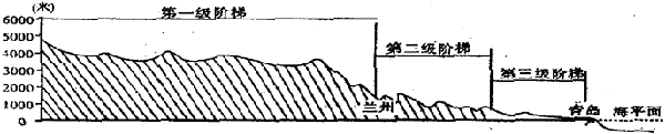 (3)图中所显示的第一、二、三级阶梯的地形分别是什么地形区?海平面又是什么海的海平面?(4分)