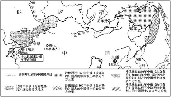 清朝前期的疆域广大,西北达巴尔喀什湖北岸,东北至黑龙江以北的外兴安岭和库页岛。同目前中国版图对比,中国的西北、东北疆域有何变化?为什么会发生这一变化?
