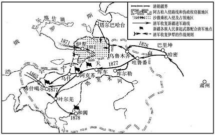 [课程导入] 新疆位于我国西北部,土地面积166万平方公里,占我国全部国土面积的1/6。你能够结合以前学过的中国古代史知识,说说为什么新疆地区自古以来就是中国的领土吗? 新疆不仅物产丰富,而且战略地位非常重要,是我国的西北门户。既然这个地区这么重要,会不会引起别的国家的侵略野心呢? 19世纪六七十年代,我国东南沿海和西北边疆同时出现了危机。围绕“塞防”和“海防”问题,清政府内部出现了一场大争论。你知道这次争论的主要内容吗?争论的结果又怎么样呢? 面对边疆出现的危机,清政府采取了怎样的策略?派谁去收复新疆?他是怎样进军的呢?最终的结果又怎样? 通过本课的学习,你就会找到上述问题的答案。 [知识网络] [学习探索] 1.了解古代“丝绸之路”的路线,叙述一下从汉朝至清朝,中央政府对新疆地区是如何管辖的。 丝绸之路 2.根据下面的《收复新疆示意图》,讲讲左宗棠的进军路线及收复新疆的简单经过。你认为左宗棠能够收复新疆的原因有哪些? 收复新疆示意图 [资料下载] “塞防”“海防”之争 19世纪70年代,世界各主要资本主义国家为了争夺原料产地、商品市场和资本输出场所,展开了一场争夺殖民地、瓜分世界领土的狂潮。英、美、俄、日等国纷纷把侵略的黑手伸向中国广大边疆地区,使中国边疆地区出现了一场严重危机。 19世纪六七十年代,美、日先后派兵侵略中国台湾;在西南边疆,英国侵略势力也不断深入云南、西藏等地;与此同时,俄国也极力向我国新疆地区扩张。1865年,中亚浩罕国派阿古柏率兵侵入新疆,擅自宣布建国,自立为汗。英、俄两国为了在新疆扩大侵略势力,竞相勾结和支持阿古柏。1871年,俄国还直接出兵侵占了新疆的伊犁地区。 新疆危机的严峻形势,加上东南沿海地区的紧张局面,特别是日本侵略台湾事件的影响,使清朝统治集团内部在东南“海防”和西北“塞防”的问题上,展开了一场大争论。直隶总督李鸿章强调海防的重要性,以“海防、西征,力难兼顾”为由,主张“移西饷以助海防”,即不惜放弃新疆而全力经营由他控制的海军建设。湖南巡抚王文韶认为沙俄是中国最大的威胁,主张全力加强西北塞防。左宗棠则力排众议,主张“东则海防,西则塞防,二者并重”,不可偏废。他指出,新疆乃中国西北门户,“若此时而拟停兵节饷,自撤藩篱,则我退寸而贼进尺,不独陇右堪虞,即北路科布多、乌里雅苏台等处恐亦未能晏然”,把收复新疆提到保卫国家安全的高度。清政府接受了左宗棠的建议,并于1875年任命他为钦差大臣,督办新疆军务,以武力收复新疆。 从本质上看,“塞防”“海防”之争是关系到要不要收复新疆、要不要维护国家主权与领土完整的大是大非问题。以左宗棠为代表的“塞防海防并重论”,是符合中国人民长远利益的。 [思维拓展] 学会全面客观地评价历史人物,是历史学习的一个重点。就左宗棠来看,他既镇压过太平天国运动,同时也率军收复了新疆。对于这个问题,应该怎么看?你能否对左宗棠作出一个客观公正的评价? |