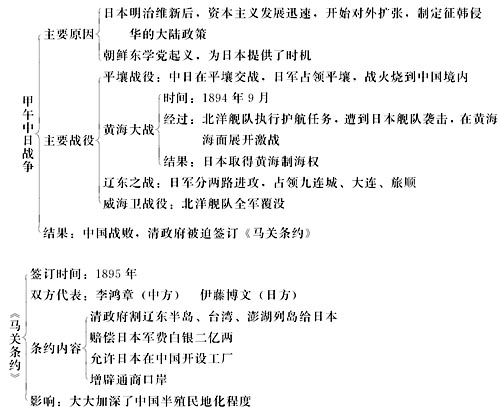 [课程导入] 中华民族既是一个伟大的民族,又是一个灾难深重的民族。在近代历史上,积贫积弱的中国曾不断遭受到外来侵略。你知道1894-1895年中国遭受到哪一个国家的侵略?发生了什么战争?你能说出战争爆发的原因、主要战役及结果吗? “此日漫挥天下泪,有公足壮海军威。”你知道这副沉重的挽联是为了哀悼谁而写的?他是在什么战役中牺牲的?你能说说关于他的英雄事迹吗? 黄海大战 1895年,有人写出这样的对联: “台湾今已归日本, 颐和园又搭天棚。” 台湾自古以来就是中国的领土,你知道它为什么“今已归日本”吗?是什么条约使之归日本的?你知道该条约的主要内容吗?它给中国带来了什么危害?“颐和园又搭天棚”干什么?两件事联系在一起,说明了什么问题? 台湾被割占,激起了台湾人民的强烈反抗。你能谈谈台湾人民反抗日本殖民统治的英雄事迹吗? 甲午战争是19世纪末发生的一场对中国乃至世界都产生了重大影响的战争。这次战争的结果,不仅进一步加深了中国的半殖民地半封建化程度,而且也使列强在中国的力量对比和格局发生了重大变化。这种变化是什么呢? 带着这许许多多的问题,让我们进入本课的学习吧。 [知识网络] [学习探索] 1.全班同学每6人为一小组,合作制作甲午中日战争示意图的课件,标出重要战役和重大事件的地点及日军进犯的路线图,进行小组课件展示评比。 2.1895年,有人题联于京师城门:“万寿无疆,普天同庆;三军败绩,割地求和。”此联反映了哪些史实?说明了什么? 3.俄法德三国干涉还辽事件,你认为是维护中国的主权吗?它们干涉还辽的真正目的是什么? [资料下载] 北洋舰队──中国第一支近代化海军 海军是近代工业化的产物。清朝原有旧式水师,并无近代海军。在两次鸦片战争中,西方列强的“坚船利炮”,使国人开始意识到建立一支中国近代化海军的重要性。 1862年,为了镇压太平天国,清政府委托原海关总税务司英国人李泰国向外国订购一支舰队。次年,在英国购买的七艘船舰由英国海军上校阿思本率领来到中国。由于对舰队的指挥权问题争执不下,清政府最后遣散了这支舰队。通过这一事件,清政府认识到独立发展自己海军的重要性。1866年,清廷批准了闽浙总督左宗棠的奏折,在福建马尾设立总理船政事务衙门,并开设造船厂和水师学堂,迈出了我国近代海军建设的第一步。 1874年,日本侵犯台湾。在当时中国人的眼里,日本仅是一个落后的东方小国,但它居然凭借几艘军舰就敢侵犯大清帝国。这一事件使中国朝野上下大为震惊,“于是有海防之议”。1875年,清政府决定建立北洋、东洋、南洋三支海军,并下令由两江总督沈葆桢和直隶总督李鸿章分任南北洋大臣,从速建立南北洋水师。同时规定,每年拨款400万两白银作为海军军费。沈葆桢从大局出发,认为军费分散则成功太慢,应全力先建设北洋水师。清政府考虑到当时日本的威胁,采纳了沈葆桢的建议,“先于北洋创设水师一军”,等北洋水师实力雄厚后,再“以一化三,变为三洋水师”。北洋的成军之路由此开始。 自1875年起,清政府陆续从英、德等国购进各种军舰多艘,并派遣学生赴英、法等国学习海军。1879年,李鸿章在天津设水师营务处,办理北洋海军事务。1880年,李鸿章设天津北洋水师学堂,不久又先后在旅顺、大连、威海等地修筑炮台,建设军港。1881年,李鸿章奏准任命淮军将领丁汝昌为北洋水师提督。1885年,清政府设立海军衙门;同年,从德国订造的两艘铁甲舰编入北洋舰队,分别被命名为定远舰、镇远舰。1888年,从英、德两国订购的四艘巡洋舰也被编入北洋舰队,分别被命名为致远舰、靖远舰、经远舰、来远舰。至此,北洋舰队正式编练成军,共有军舰25艘,包括2艘铁甲舰、7艘巡洋舰,官兵4 000余人。北洋舰队的建立,使近代中国拥有了一支在当时号称世界第六、亚洲第一的海军舰队。 然而,北洋舰队自成军之日起便止步不前了。这主要是由于清政府满足于现状和慈禧太后挪用海军经费去修筑颐和园等原因所致。从北洋海军正式成军至甲午战争前,日本却倾全国之力发展海军,添置军舰,使得日本海军在舰船总吨位、航速和炮火发射能力等方面均超过了北洋海军。广大北洋官兵在甲午战争中虽然英勇杀敌,浴血奋战,却最终未能挽回失败的命运,强盛一时的北洋舰队也随之全军覆没了。 [思维拓展] 甲午战争的失败,不仅使清政府苦心经营二十年的北洋舰队全军覆没,而且还被迫同日本签订了丧权辱国的《马关条约》。对于战争的结果,有人认为中国战败是必然的。你怎样看待这一问题? |