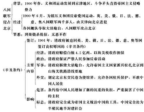 你知道腐败的晚清政府被迫同外国侵略者签订的中国近代史上三大不平等条约吗?除了《南京条约》、《马关条约》,还有一个叫什么?它是怎样签订的?有什么主要内容?给中华民族带来哪些严重危害? 通过本课的学习,同学们一定能够找到这些问题的答案。 《辛丑条约》签订情景 [知识网络] [学习探索] 1.在第二次鸦片战争中,有“万园之园”之称的圆明园被英法侵略者付之一炬。请收集有关圆明园的资料、图片,向同学们介绍一下圆明园的历史。 3.根据你的兴趣和爱好,选择参加下列小组活动。 活动一:6月26日是联合国确定的“国际禁毒日”,请以“一百六十多年前中国禁毒斗争”为主题出一期班级板报,最好做到图文并茂。 活动二:一些英国历史学家认为,鸦片战争的爆发完全是由于清政府的闭关自守。请组织几个对辩论感兴趣的同学,通过正反方辩论赛的方式对这种观点进行反驳。 [资料下载] 半殖民地半封建社会 近代中国社会既不同于鸦片战争前的封建社会,也不同于一般的资本主义社会。它是半殖民地半封建社会。 “半殖民地半封建”不能理解为一半是殖民地一半是封建的,也不能理解为政治上是殖民地,经济上是封建的。“半殖民地”是相对于完全殖民地而言的,是指丧失了部分而不是全部的独立自主权;“半封建”是相对于完全的封建社会而言的,是指既保存了封建主义,又发展了资本主义。半殖民地半封建的中国社会具有以下一些基本特点。 (1)封建自然经济的基础虽然遭到了破坏,但封建剥削制度依然存在,地主阶级对农民的剥削,同买办资本、官僚资本和高利贷资本的剥削结合在一起,在中国的社会经济生活中仍然占着优势地位。封建主义是帝国主义和官僚资本主义的同盟者及其统治的基础。 (2)民族资本主义虽然有了一定的发展,并在中国的政治文化生活中起了很大作用,但它同外国资本主义和本国封建主义或多或少都有联系,没有成为中国社会经济的主要形式,力量软弱,不可能冲破帝国主义、封建主义和官僚资本主义的束缚。 (3)帝国主义在中国的势力不仅强大,而且根深蒂固。它和中国的反动势力相互勾结,不但操纵了中国的经济命脉,而且控制了中国的政治中枢和军事要地。 (4)近代中国的历届政府具有极强的反动性。从清政府、北洋军阀政府到国民政府,它们不仅是压迫人民、阻碍社会进步的专制政府,而且是对外投降的卖国政府。 (5)中国经济和政治的发展呈现出极端不平衡的状态。这是由于中国是一个幅员辽阔的大国,同时由于帝国主义的侵略和封建分散的地主经济,中国长期处于不统一状态。 (6)中国人民的贫困和不自由程度世界少见。在帝国主义、封建主义和官僚资本主义的压迫和剥削下,中国广大人民日益贫困,过着饥寒交迫和毫无政治权利的生活。 [思维拓展] 一谈起鸦片战争,大家马上就会想起丧权辱国的《南京条约》,想起近代中国百年的沉沦与屈辱。你认为这场战争对中国造成的影响仅仅这些吗?在打开中国大门后,它有没有给近代中国社会客观上也带来一些符合时代潮流的新事物、新变化? |
