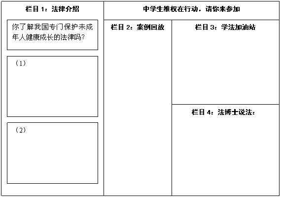 党的十七大报告提出,树立社会主义民主法制观念是公民意识的重要体现。某班准备围绕“中学生维权在行动”出一期黑板报,请你参加进来,完成以下栏目的任务: