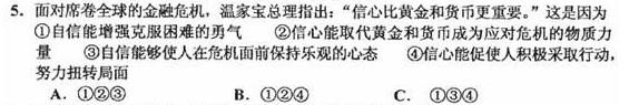 “只有信心才能产生能力和力量,只有能力和力量才能战胜困难。”“信心比黄金和货币还要贵重。”温家宝总理的这些论述启示我们( A )
