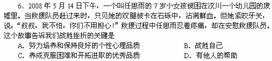 常德7.11岁的北川女孩李月,曾靠“舞蹈梦想”在地震中战胜死神。虽然失去左腿,但她仍然在北京残奥会开幕式上坚强地面对世人,重新起舞。从培养良好的心理品质来看,这启示我们( B )
