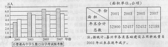 材料一:2001-2007年嘉兴各类教育人数变动状况 材料二:2001-2007年嘉兴市耕地变动状况