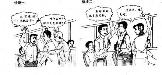 右图的文字有:情境二“真对不起,踩了您的脚”。“没关系,难免的”。