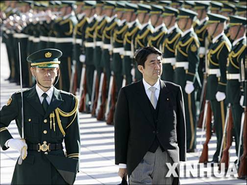 1月9日,日本首相安倍晋三(前右)在东京出席日本防卫厅升格为防卫省的仪式。当天,根据此前日本国会众参两院批准的法案,日本防卫厅升格为防卫省,防卫厅长官升格为防卫相。