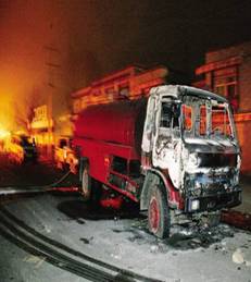 前来灭火的消防车遭到暴徒焚烧。 数暴徒打砸抢烧,纵火300余处,焚烧民宅、店铺214间。