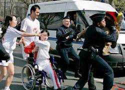 2008年4月7日北京奥运火炬传递在法国巴黎著名的埃菲尔铁塔开始环球传递第5站的传递活动,当天,由于极少数的“藏独”分子干扰北京奥运火炬的传递,无耻的“藏独”分子竟毫无人性地把黑手伸向了坐在轮椅上的金晶,试图要从金晶手中抢走火炬。金晶面对突如其来的冲击,毫不畏惧,用双手紧紧抱着火炬,她在用她那残弱的身驱捍卫着奥运精神,这个画面打动了许许多多人们的心弦。