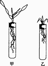 ③将两株生长状况相同的幼苗同时分别培养在甲和乙中,过一段时间后长势情况如右图。