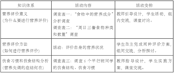 本节内容分两课时完成,本节课重点围绕营养评价、饮食习惯和饮食结构两大内容,以学生自主活动、课堂交流展开,教师适时引导和指导。