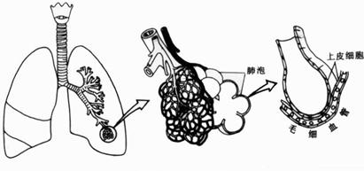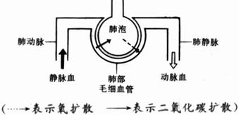 肺泡内氧气浓度大,肺泡周围毛细血管血液中氧气浓度小,所以氧气从肺泡中扩散到血液中;肺泡内二氧化碳浓度小,肺泡周围毛细血管血液中二氧化碳浓度大,所以二氧化碳从血液中扩散到肺泡中。经过此过程血液由静脉血变为动脉血。