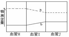 右图的曲线表示三种血管H、I、J中血液内氧气与二氧化碳含量的变化。图中H为主动脉,请据图回答: