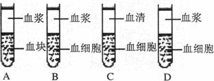 2.将新鲜的血液分别放入A、B、C、D四支试管中,其中A、B试管中不加任何物质,C、D试管中加入抗凝剂,静置24小时后,正确的图示是( )