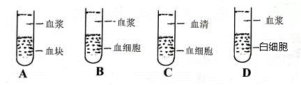 8、如下图,将新鲜的血液分别放入A、B、C、D四支试管中,其中A、B试管中加入抗凝剂,C、D试管中不加任何物质,静置24小时后,其中正确的图示是( )