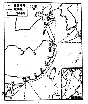 (1) 在空白处填出相应的地理名称,其中字母所代表的是我国主要的海港。