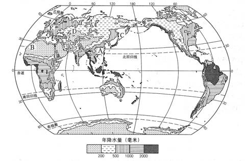 (2)A地与B地都在______________(纬线)附近,A地年平均降水量是____________,B地是_______________。
