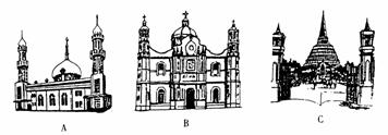⑴A、B、C各图分别是哪种宗教的建筑物?A____;B____;C____。