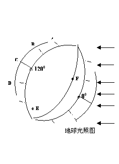 1)、在图上标出自转方向,用阴影或斜线表示出夜晚的那个半球(2分);