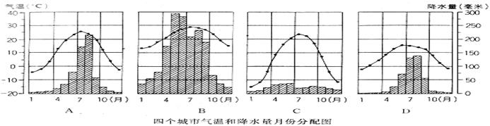 3.分析四个城市气温和降水月分配图,回答问题(10分);