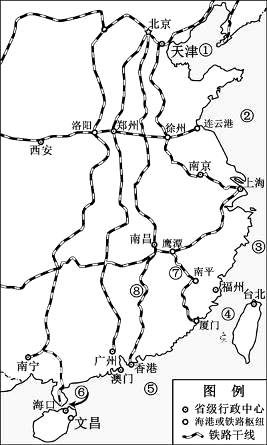 资料二:我国将在天津建设“长征5号”系列重型运载火箭生产基地,在海南省文昌市(如下图--我国东部、中部地区主要铁路干线、海港分布图)建设航天发射基地,未来天津制造的长征5号火箭将直接运往海南文昌发射。
