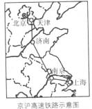 (2008济宁) 2008年4月3日,铁道部宣布,中国第一条具有世界先进水平的高速铁路--京沪高速铁路今年开工建设,并将于2010年投入运营。设计时速350千米,全程运行时间5小时。结合下图完成31-32题。