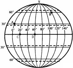 (1)写出A、B两点的经纬度(地理坐标)。 A__________________ B_________________ (2)A位于B的_______ 方向。A、B均位于五带中的____ 带。 (3)点C、D都在赤道上,C位于D的_______ 方向。根据地球自转规律可以判断C、D中先看到太阳升起的是______ 。 (4)由图可看出,A、B、C、D都在 (东、西)______半球。