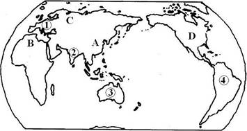 (2)图中A地的主要人种是___________________, 居民主要通用的语言是___________________; B地的主要人种是___________________, 信奉的宗教是_________________; C地的官方语言是_________________, D地的主要人种是___________________.